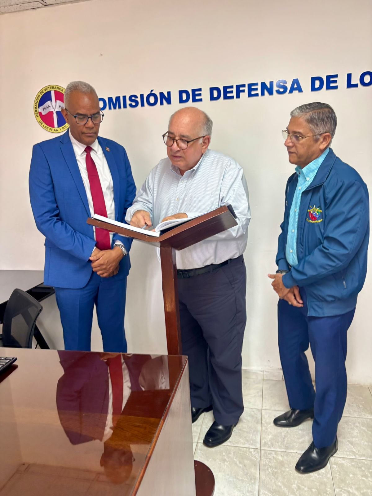 El Mayor General (R) Valerio García Reyes, ERD. Presidente de la Hermandad de Veteranos FF.AA. y P.N. recibió en su despacho al abogado, historiador y comunicador Dr. José Baez Guerrero, quien se comprometió a colaborar con la Hermandad y se integrará como miembro del Consejo del Museo de la Defensa e Identidad Nacional aportando sus conocimientos y piezas históricas.